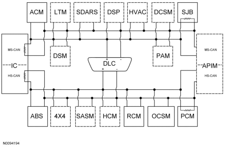 Vehicle communication utilizes Medium Speed (MS) and High Speed (HS) Controller Area Network (CAN) communications. CAN is used for many modules to communicate with each other on a common network. CAN in-vehicle networking, is a method for transferring data among distributed electronic modules via a serial data bus. Without serial networking, intermodule communication requires dedicated, point to point wiring resulting in bulky, expensive, complex, and difficult to install wiring harnesses. Applying a serial data network reduces the number of wires combining the signals on a single network. Information is sent to the individual control modules that control each function.