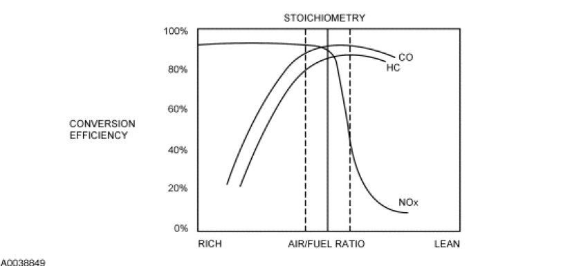 A TWC requires a stoichiometric fuel ratio, 14.7 pounds of air to 1 pound of fuel (14.7:1), for high conversion efficiency. In order to achieve these high efficiencies, the air/fuel ratio must be tightly controlled with a narrow window of stoichiometry. Deviations outside of this window greatly decrease the conversion efficiency. For example a rich mixture decreases the HC and CO conversion efficiency while a lean mixture decreases the NOx conversion efficiency.