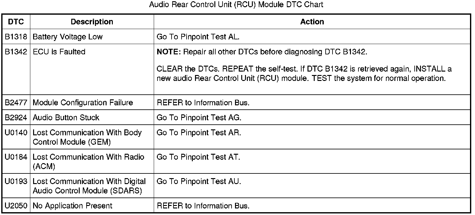 Audio Rear Control Unit (RCU) Module DTC Chart