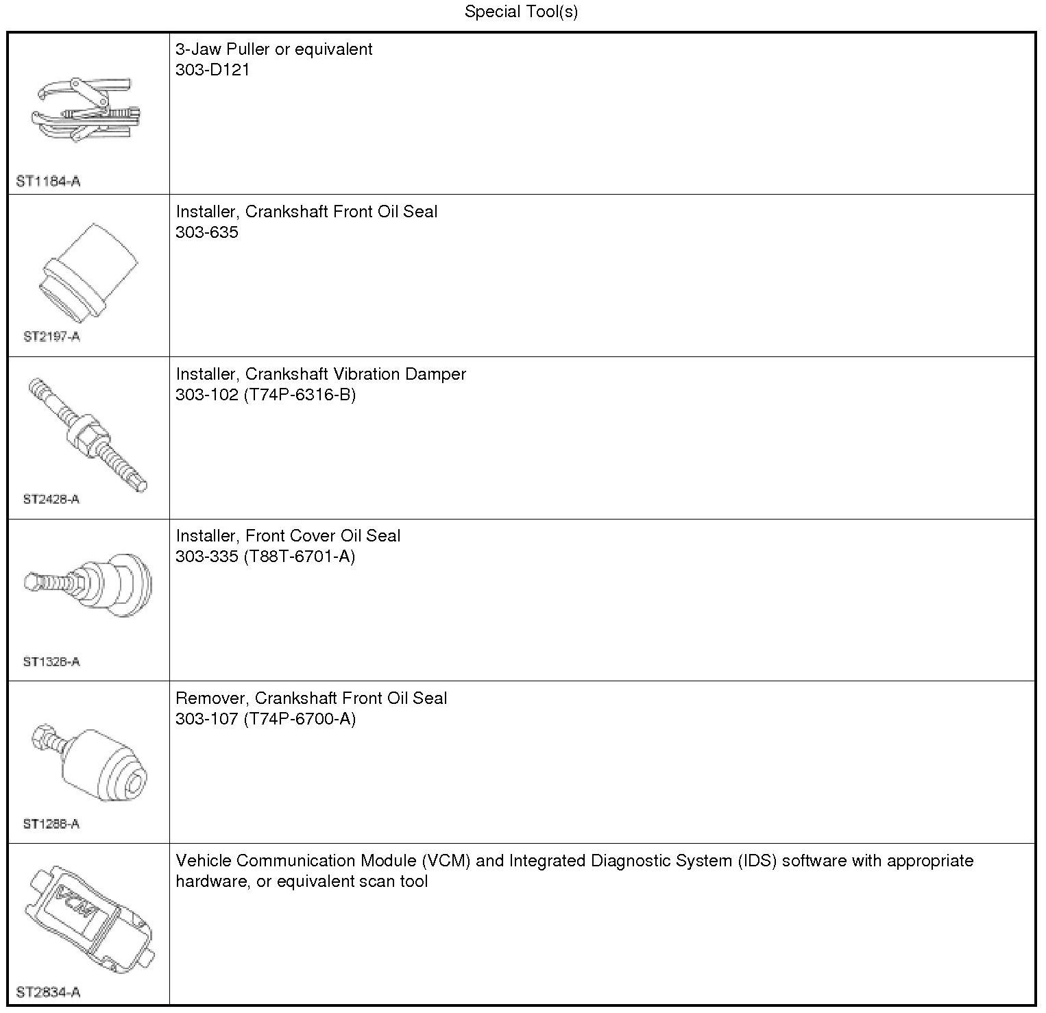 10. Using the Crankshaft Vibration Damper Installer, Front Cover Oil Seal Installer and the Crankshaft Front Oil Seal Installer, install a new crankshaft front seal into the engine front cover.