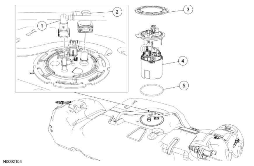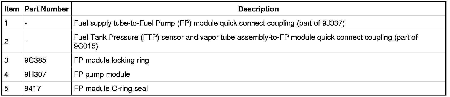 4. Disconnect the Fuel Tank Pressure (FTP) sensor and vapor tube assembly-to-FP module quick connect coupling and the supply fuel tube-to-FP module quick connect coupling.