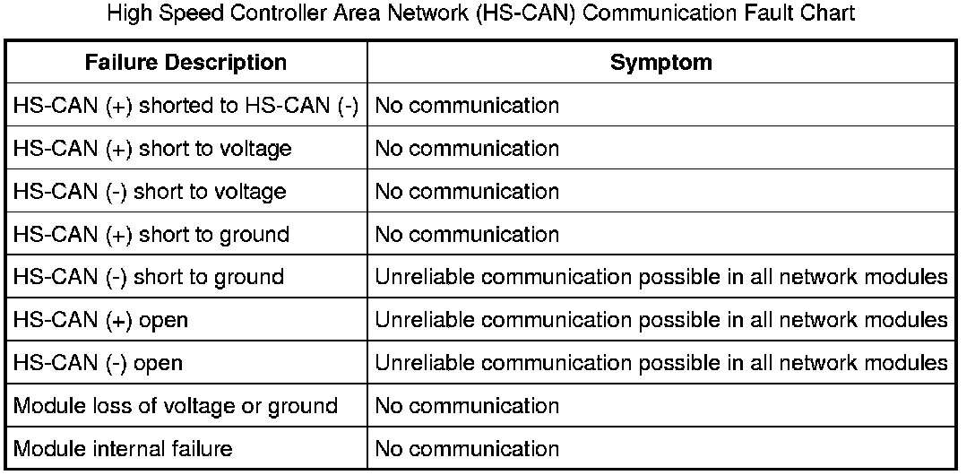 The following fault chart describes the specific HS-CAN failures and their resulting symptom: