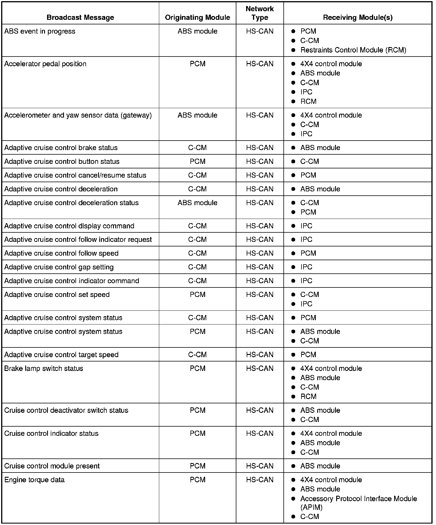 NOTE: While there are numerous messages internal to the adaptive cruise control system module, the following messages are utilized by the adaptive cruise control system in conjunction with outside systems.