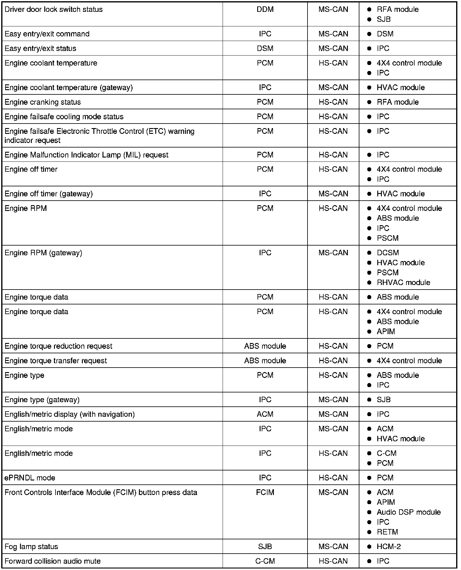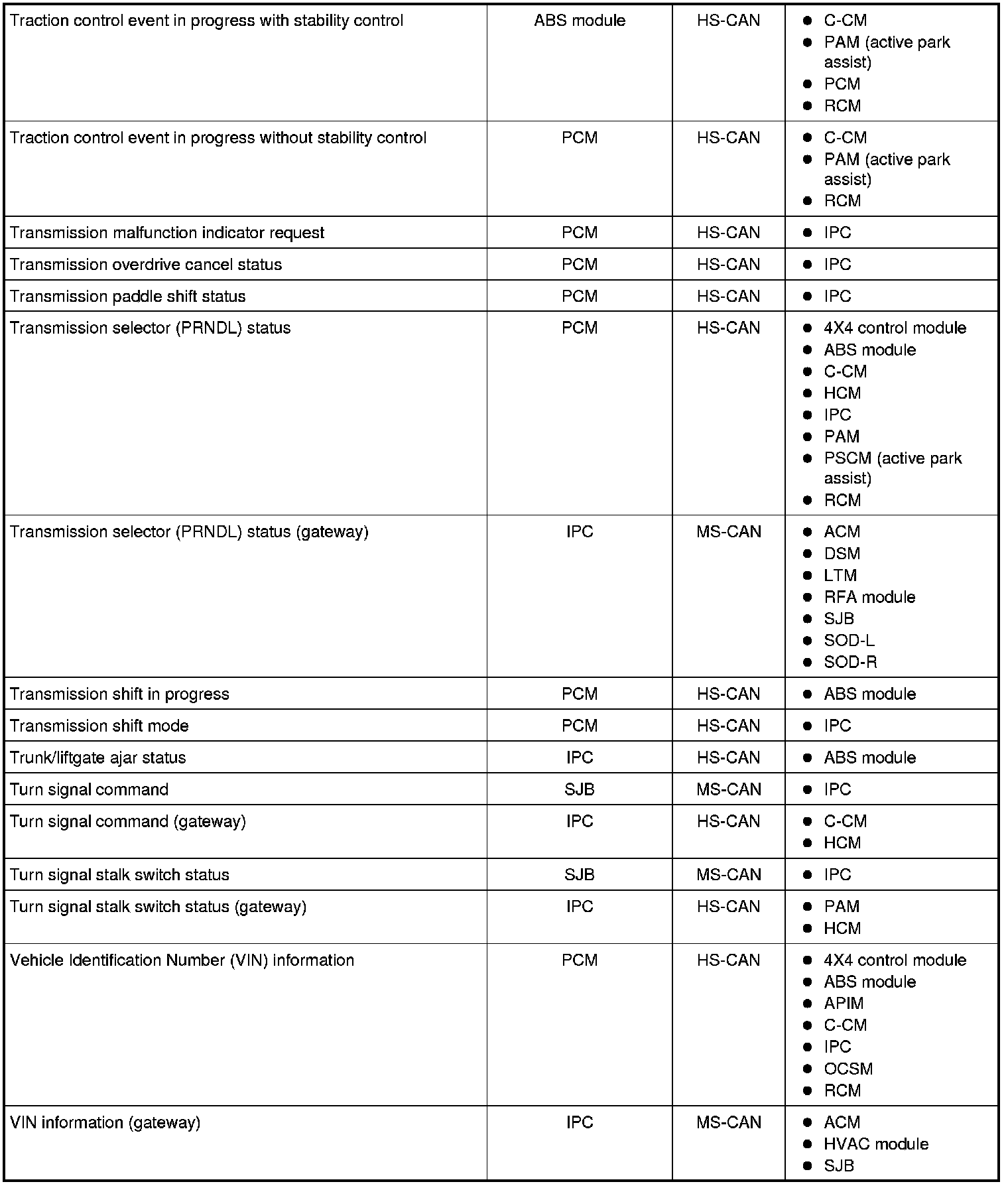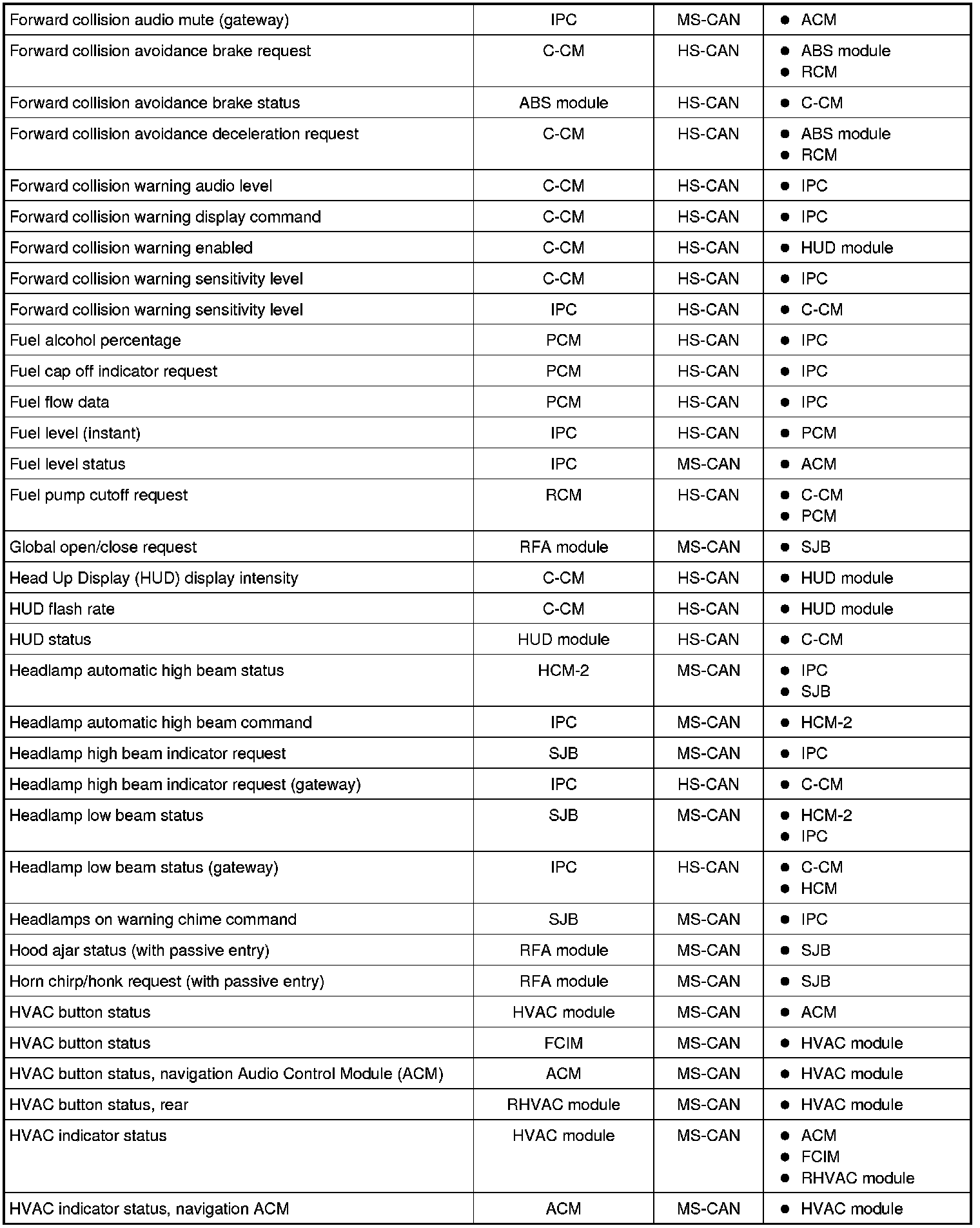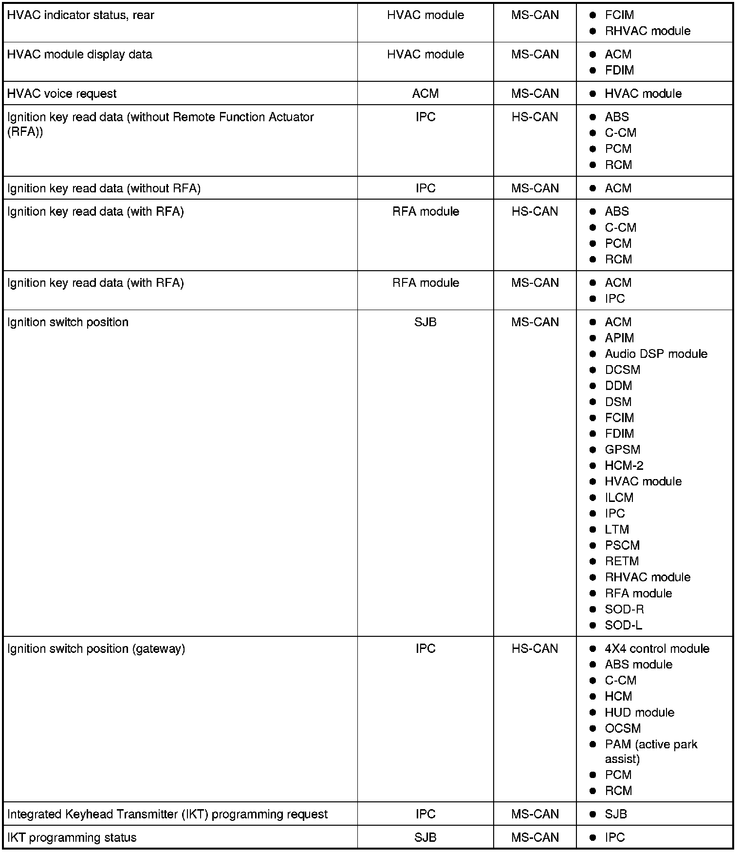 NOTE: This chart describes the specific HS-CAN and MS-CAN messages broadcast by each module, and the module(s) that receive the message.
