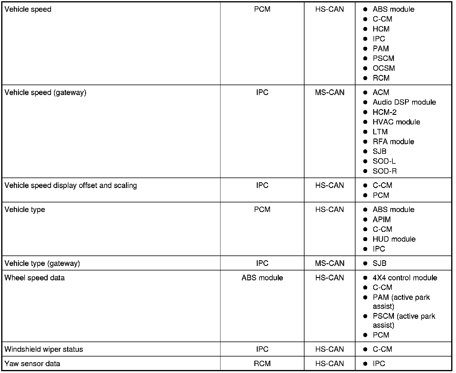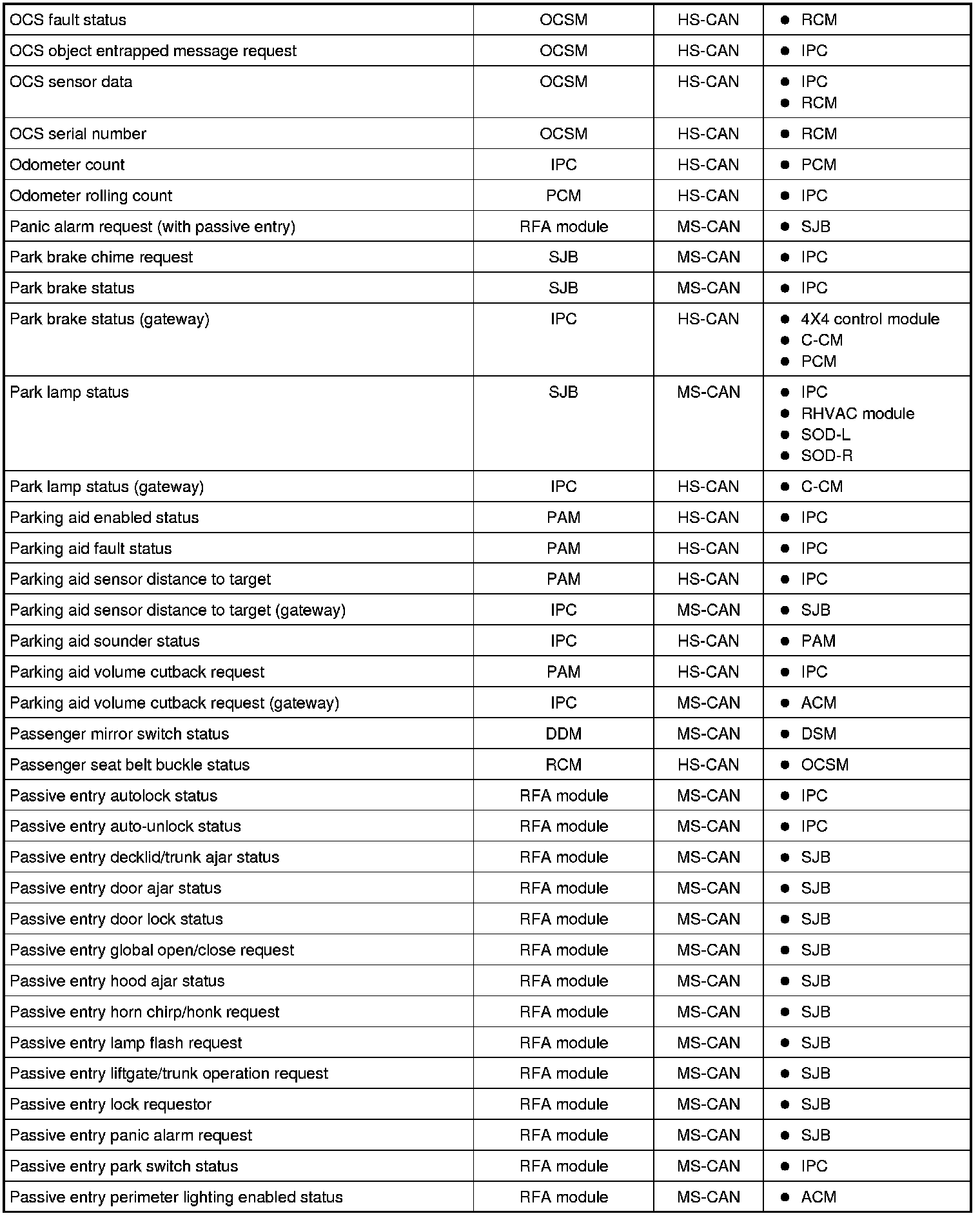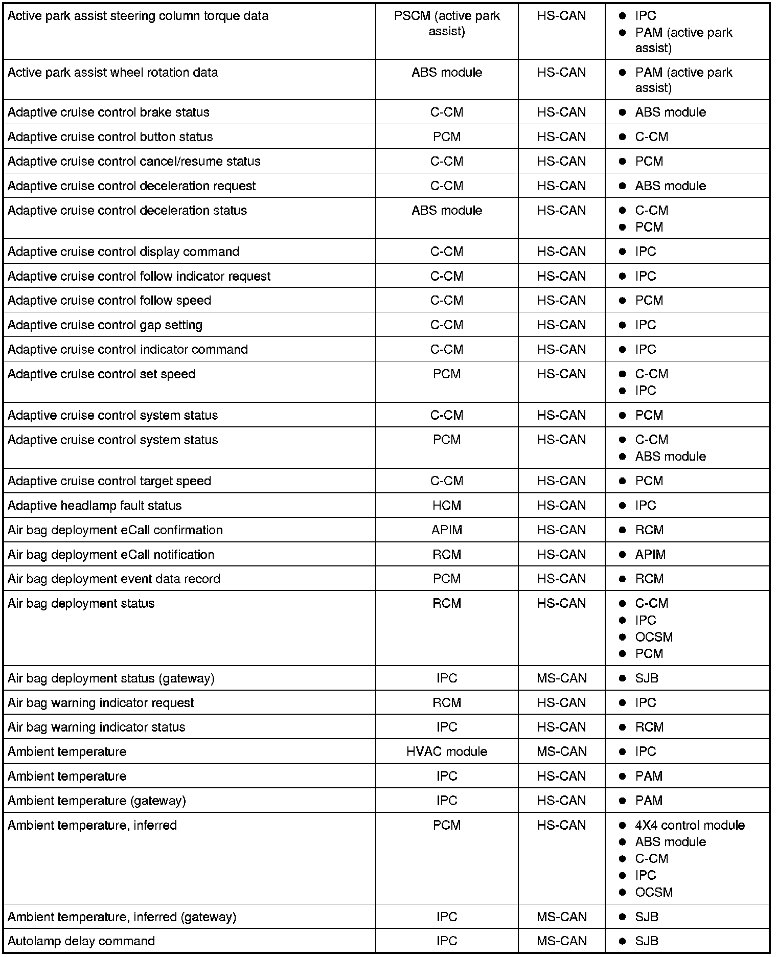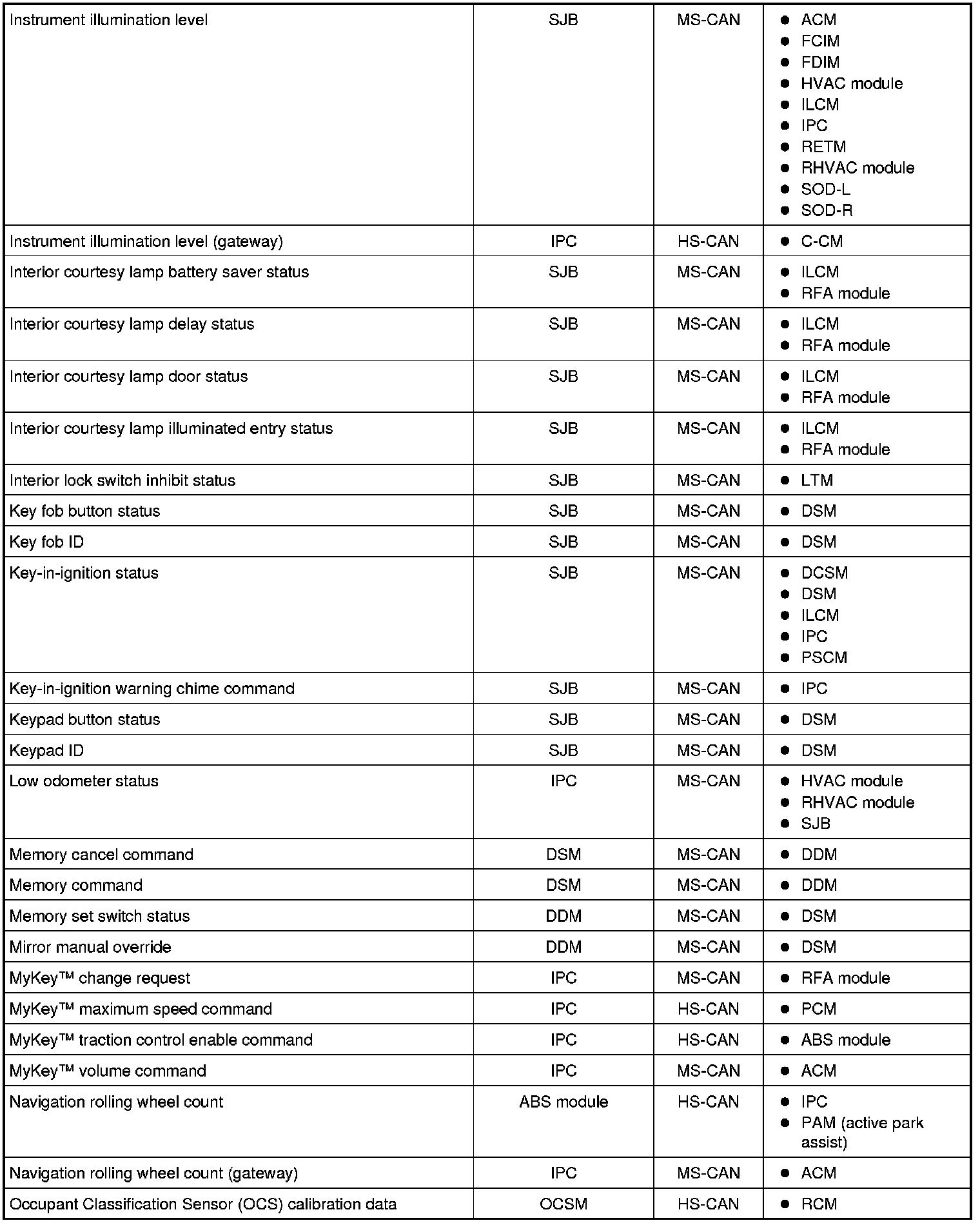 NOTE: This chart describes the specific HS-CAN and MS-CAN messages broadcast by each module, and the module(s) that receive the message.