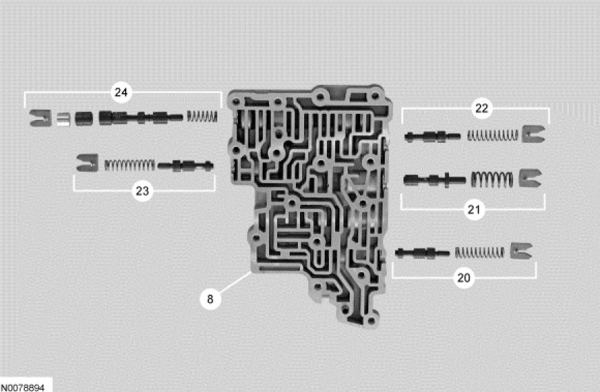 8. NOTICE: Remove the valves by tapping the valve body on the palm of the hand to slide the valves out of the bores. It may be necessary to remove the valves and springs using a pick. If it is necessary to use a pick, use extreme caution to prevent damaging the valves or valve bores. If necessary, disassemble parts of the main control valve body in small groups. Take special care when handling the main control components, since they are the most precise and delicate parts of the transaxle. Neatly arrange the parts as they are removed to avoid mixing similar pieces.