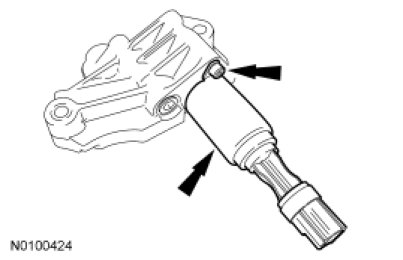 1. Remove the screw and the Variable Camshaft Timing (VCT) oil control solenoid.