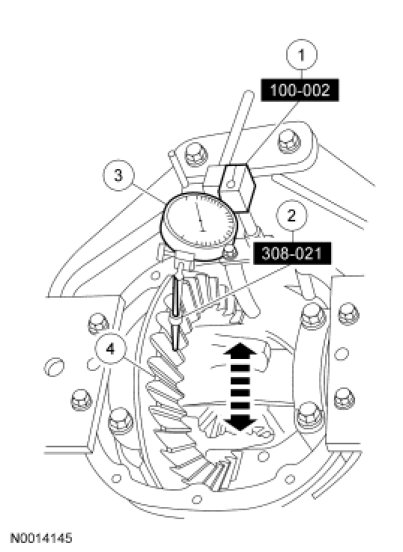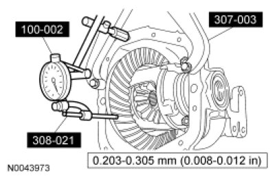 4. Turn the differential ring gear without turning the drive pinion gear. Record the Dial Indicator Gauge reading. The allowable backlash is mm (0.008 in) to 0.305 mm (0.012 in).