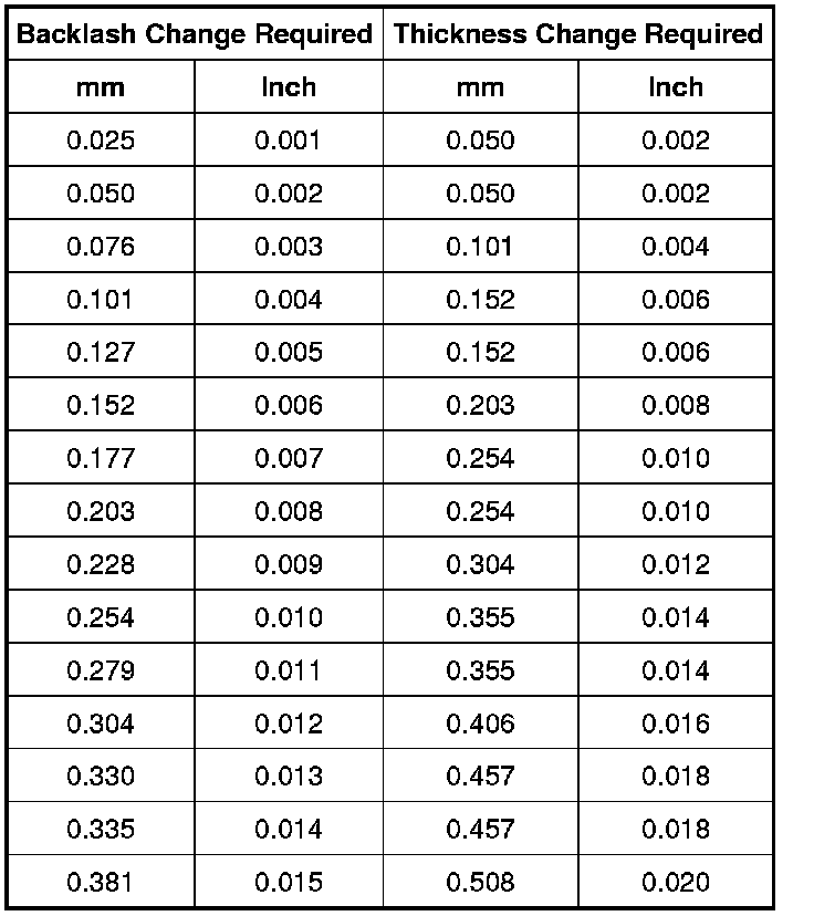 6. To correct for high or low backlash, increase the thickness of one differential bearing shim and decrease the thickness of the other differential bearing shim by the same amount. Refer to the following tables when adjusting the backlash.
