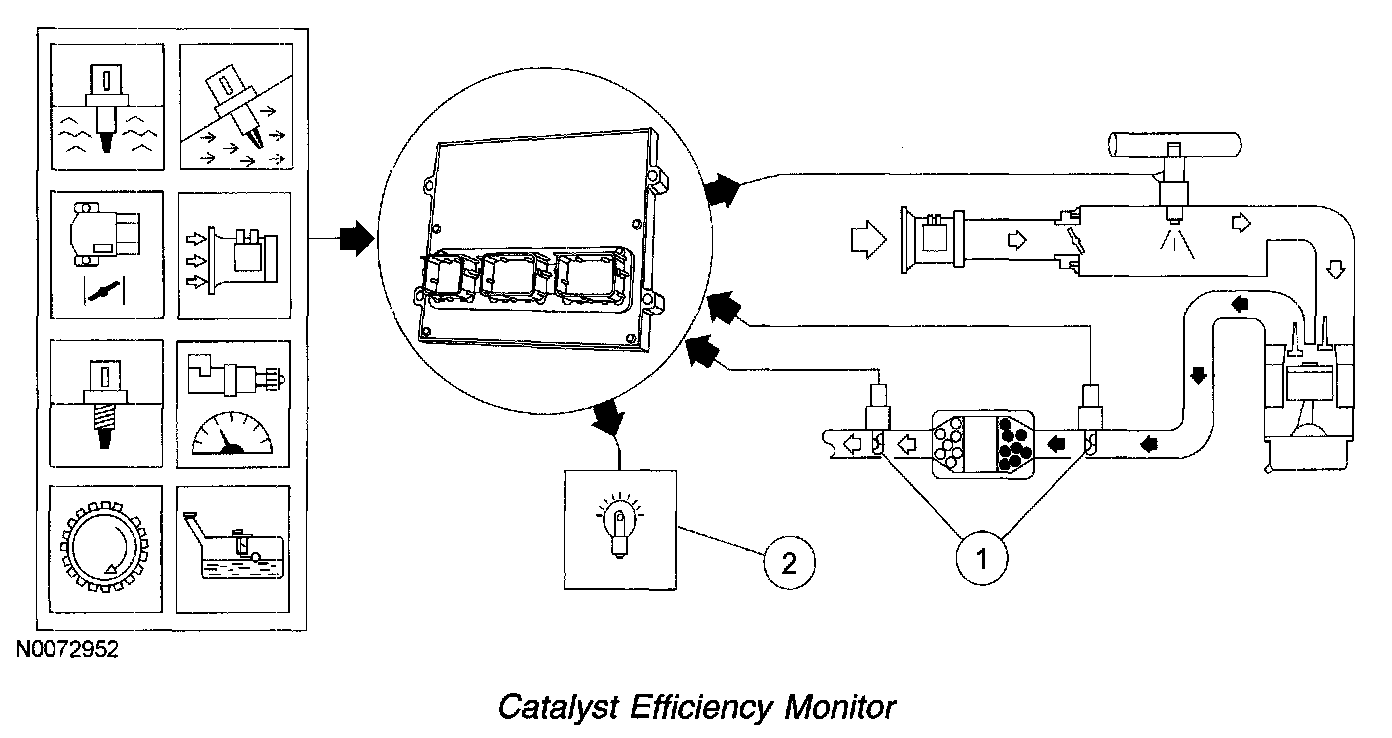 Inputs from engine coolant temperature (ECT) or cylinder head temperature (CHT), intake air temperature (IAT), mass air flow (MAF), crankshaft position (CKP), throttle position (TP), and vehicle speed sensors are required to enable the catalyst efficiency monitor.