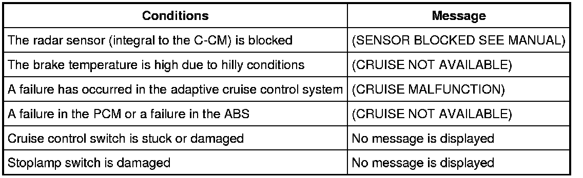 There are several conditions that can exist to cause the adaptive cruise control system to deactivate or prevent the system from activation. Some of the conditions have a message that is displayed in the message center. These conditions include: