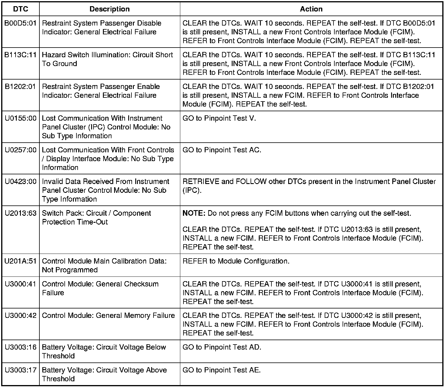 Front Controls Interface Module (FCIM) DTC Chart