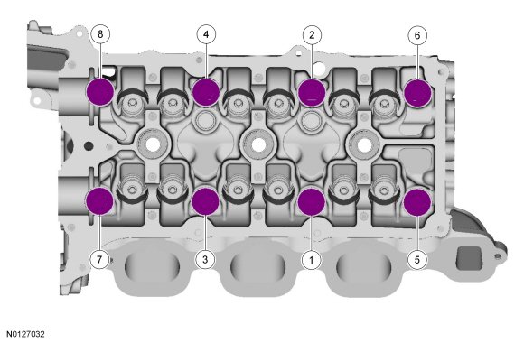 - Stage 1: Tighten fasteners 1 through 8 to 45 Nm (33 lb-ft).