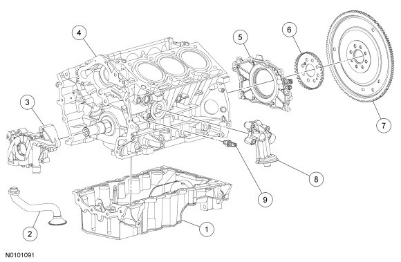 - Apply a 5.5 mm (0.21 in) bead of Motorcraft(R) High Performance Engine RTV Silicone to the 2 crankshaft seal retainer plate-to-cylinder block joint areas on the sealing surface of the oil pan.