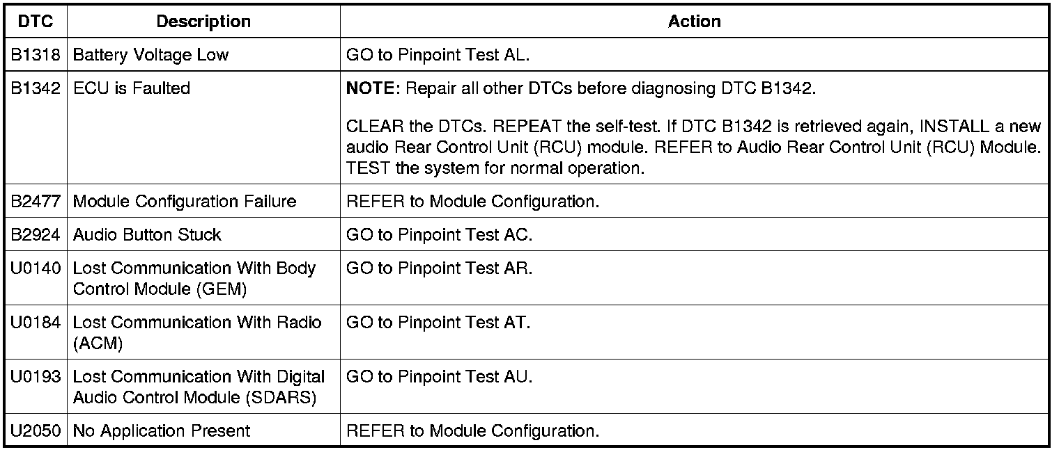 Audio Rear Control Unit (RCU) Module DTC Chart