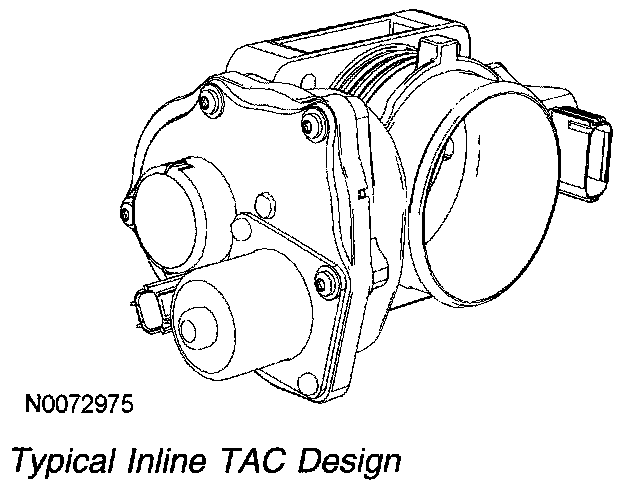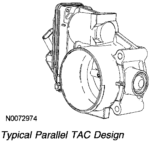 The electronic TAC is a DC motor controlled by the PCM. There are 2 designs for the TAC, parallel and inline. The parallel design has the motor under the bore parallel to the plate shaft. The motor housing is integrated into the main housing. The inline design has a separate motor housing. Both designs use an internal spring to return the throttle plate to a default position. The default position is typically a throttle angle of 7 to 8 degrees from the hard stop angle. The closed throttle plate hard stop prevents the throttle from binding in the bore. This hard stop setting is not adjustable and is set to result in less airflow than the minimum engine airflow required at idle. For additional information, refer to Torque-Based Electronic Throttle Control (ETC).