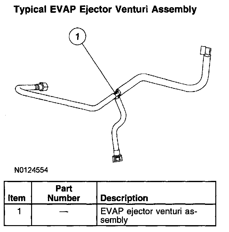 The EVAP ejector venturi assembly is used on turbocharged engines to create a vacuum in the EVAP purge line from the canister purge valve to the intake air system. During boost conditions, boost pressure flows through venturi inside the EVAP ejector venturi assembly creating a vacuum in the EVAP purge line to the intake air inlet to the turbocharger. When the second EVAP canister purge check valve is open, the purge vapor is drawn through the EVAP ejector venturi assembly into the intake air tube, through the turbocharger and charge air cooler, to the intake manifold.