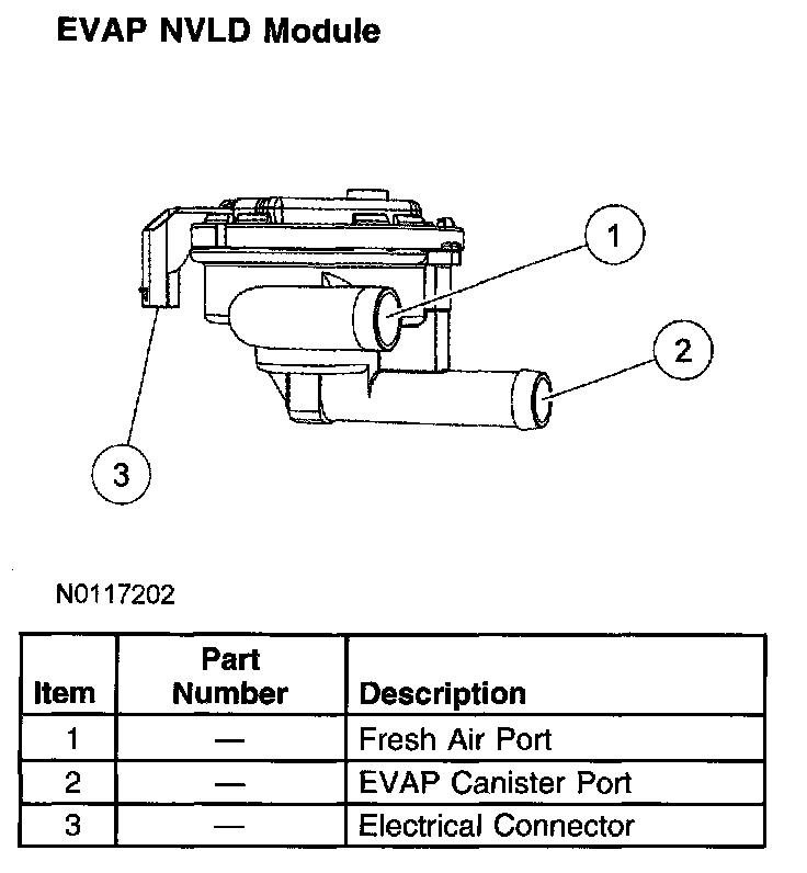 Internal to the NVLD module is a normally open vacuum switch (closes with vacuum), a normally closed vacuum relief valve (opens with excessive vacuum), a normally closed pressure relief valve (opens during refueling), an internal ambient air temperature sensor and a timer. The NVLD module completes a series of checks to confirm the integrity of the enhanced EVAP system components in the engine running state and the ignition OFF state. When the ignition is turned ON and the engine is running the NVLD module sends the information stored during the ignition OFF tests to the PCM.
