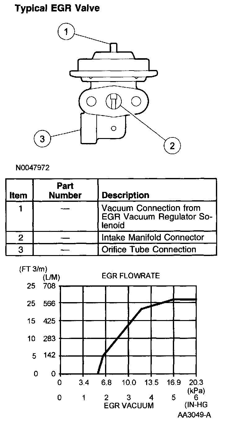 The EGR valve in the differential pressure feedback EGR system is a conventional, vacuum-actuated valve. The valve increases or decreases the EGR flow. As vacuum applied to the EGR valve diaphragm overcomes the spring force, the valve begins to open. As the vacuum signal weakens, at 5.4 kPa (1.6 in-Hg) or less, the spring force closes the valve. The EGR valve is fully open at approximately 15 kPa (4.4 in-Hg).