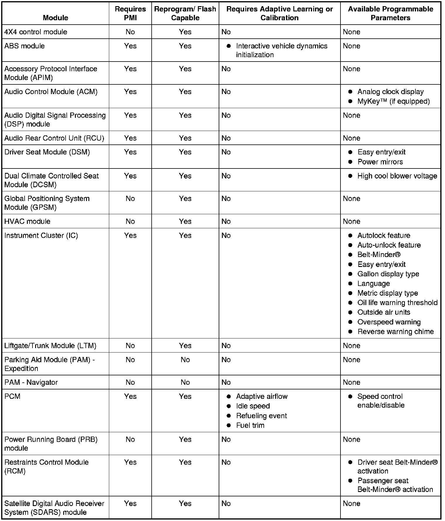 PMI is a scan tool process which configures settings in a new module. Data used for the PMI process is automatically downloaded from the original module and stored when a scan tool session is started. If this data cannot be retrieved from the module being replaced, the scan tool may prompt for As-Built data entry or display a list of parameter values that need to be manually selected. Some modules are reprogrammed during PMI when a later strategy/calibration update is available. To carry out PMI, refer to Programmable Module Installation (PMI) Programmable Module Installation (PMI).