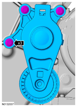 44. Remove the 3 bolts and the accessory drive belt tensioner.