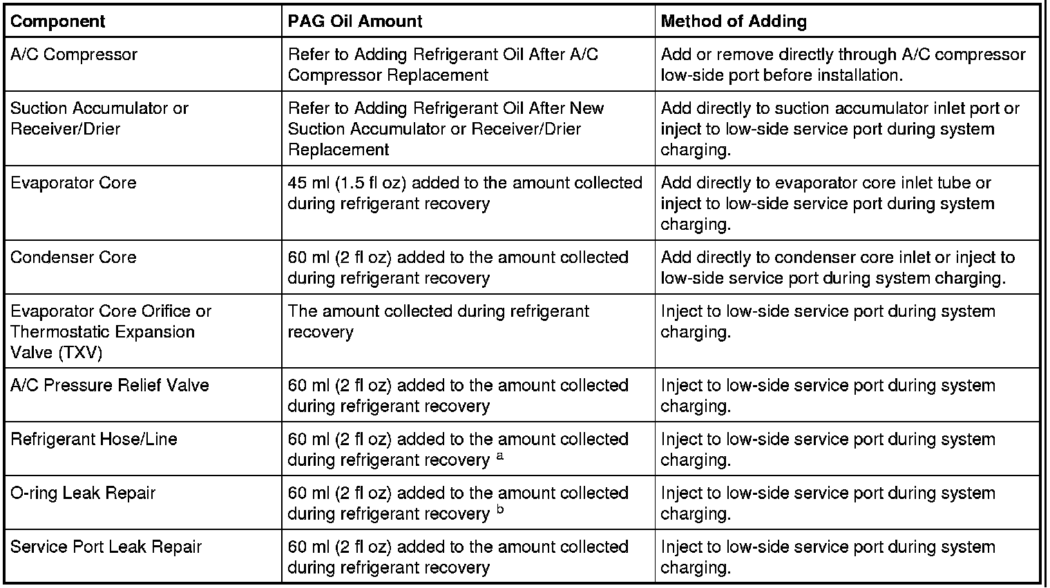 a If an excessive amount of PAG oil is lost due to a hose rupture/separation or other damage, the total system PAG oil capacity must be added.