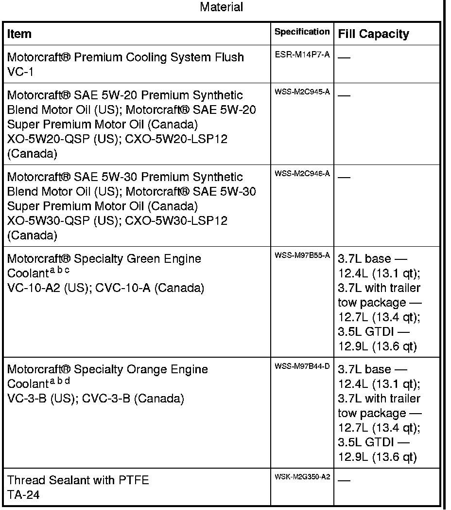 a The cooling system is filled with Motorcraft(R) Specialty Green Engine Coolant or Motorcraft(R) Specialty Orange Engine Coolant. Always fill the cooling system with the manufacturer's specified coolant. Chemically flush the cooling system if a non-specified coolant has been used.