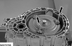Install two 10 mm x 1.50 bolts into the torque converter 6 to 8 turns to assist in handling the torque converter.