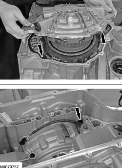 17. Remove the cover assembly and carefully route the TSS (Turbine Shaft Speed) sensor wiring harness and electrical connector out of the transaxle case.