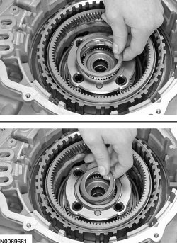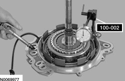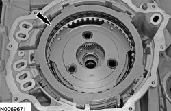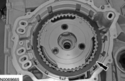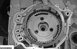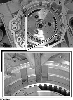 250. Measure the depth of the low/reverse clutch pressure plate where the tab fits into the gap of the low OWC (One-Way Clutch) snap ring and directly across from it. If the pressure plate is seated correctly, the depth should be the same. If the depths are different, rotate the snap ring so that the gap fits around the tab on the pressure plate.