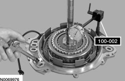 268. Position the Dial Indicator Gauge with Holding Fixture 100-002 on the direct clutch pressure plate. Apply 483 kPa (70 psi) of air pressure to the direct clutch piston port while recording the clutch pack clearance on the Dial Indicator Gauge. The clearance should be between 0.98 mm (0.038 in) and 2.34 mm (0.092 in). If the clearance is out of range, check the direct clutch pack for correct installation. If the direct clutch pack is correctly installed, install a new direct clutch pack.