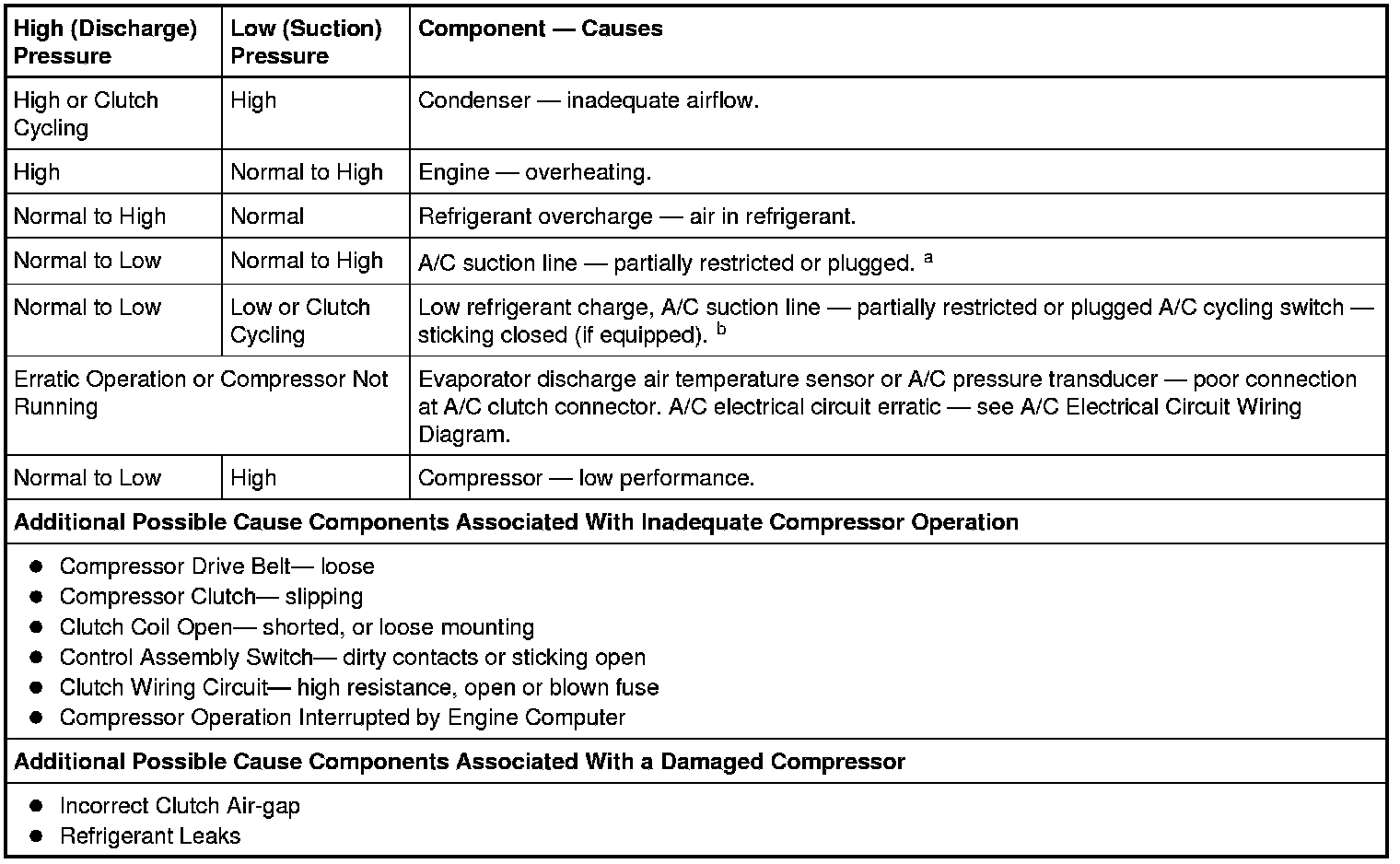 1. NOTE: The following table is used to guide diagnosis of the refrigerant system if operating pressures are outside normal limits.