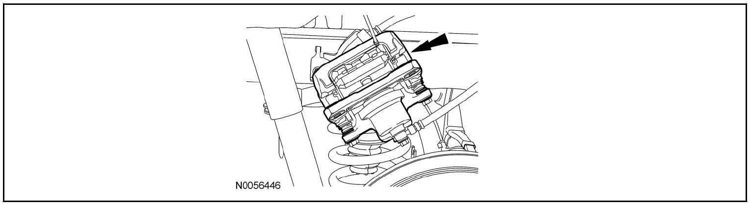 7. NOTICE: Do not allow the brake caliper and anchor plate assembly to hang from the brake hose or damage to the hose may occur.