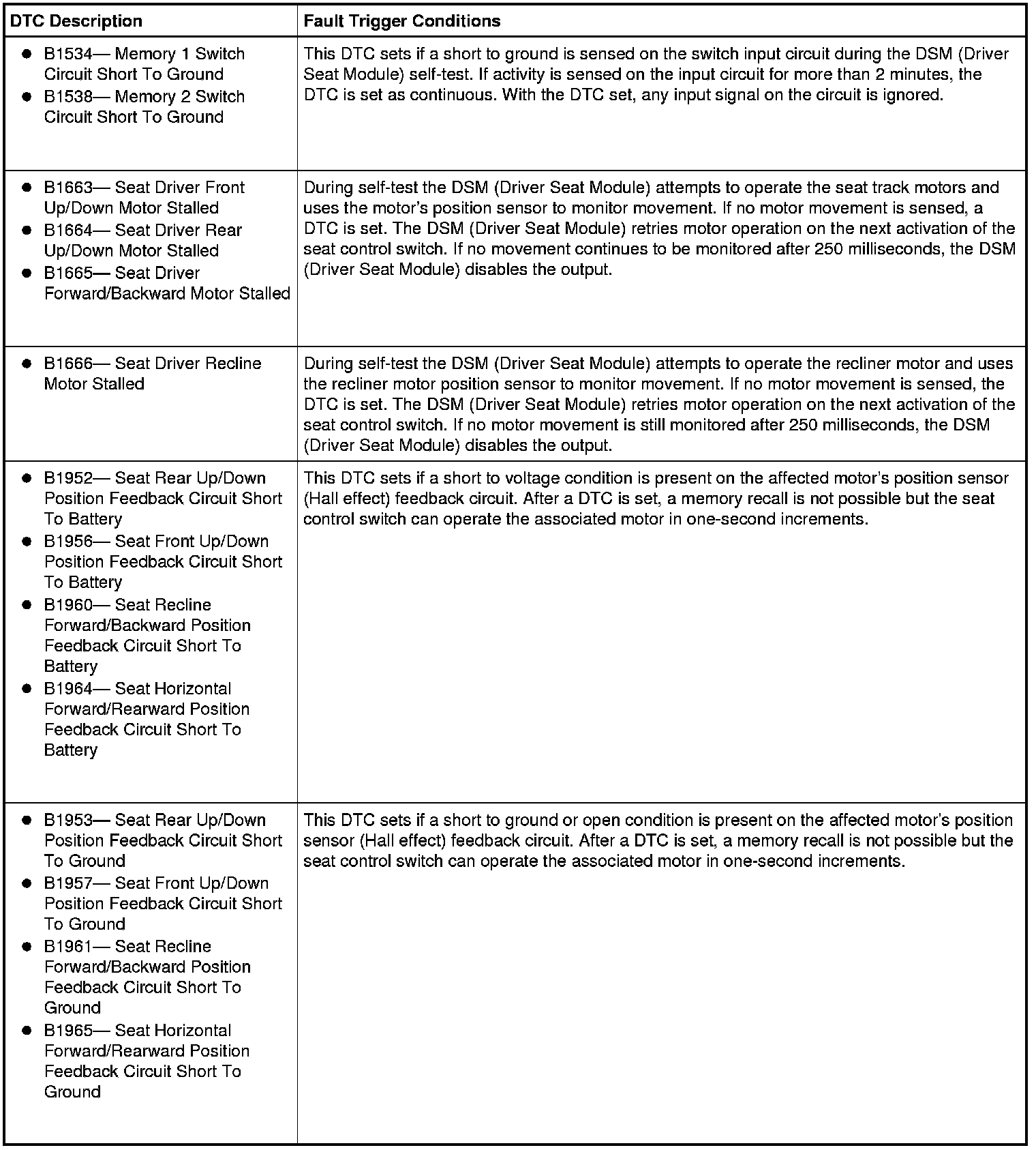 For any other DSM (Driver Seat Module) DTCs, REFER to the Driver Seat Module (DSM) DTC Chart Seats.