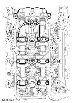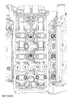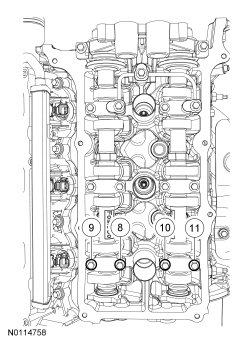 Tighten the 4 camshaft caps bolts in the sequence shown.