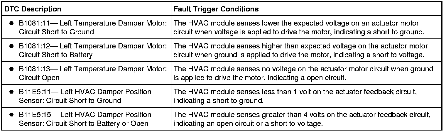 The temperature blend door actuator feedback resistors are supplied a ground from the HVAC module by the temperature blend door actuator return circuits and a 5-volt reference voltage on the temperature blend door actuator reference circuits. The HVAC module reads the voltage on the temperature blend door actuator feedback circuits to determine the temperature blend door actuator position by the position of the actuator feedback resistor wiper arm.