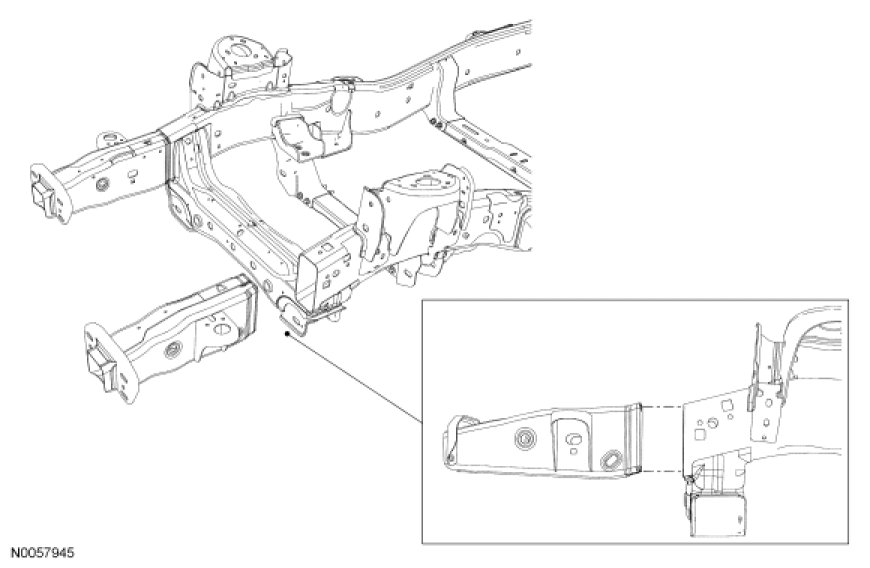 NOTICE: The following is step-by-step procedure for carrying out front frame horn replacement on Expedition/Navigator models. The Expedition/Navigator is a body on frame vehicle which is designed with energy absorbing features in the front frame horns to manage crash energy. The horn section of the frame MUST NOT be straightened if any holes or surfaces show evidence of collapse or buckling. If any evidence of damage exists BEHIND the first frame crossmember in terms of buckling or cracking, then the ENTIRE frame must be installed new.
