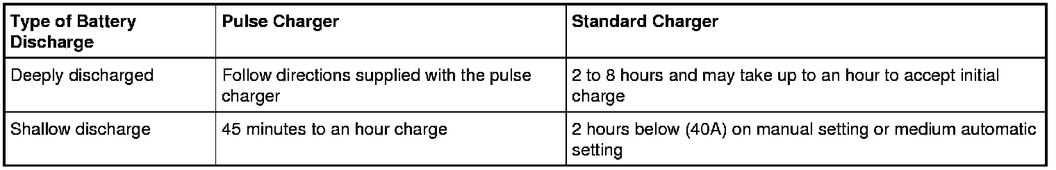 NOTE: Battery chargers have improved greatly with the addition of the new generation pulse chargers. These chargers pulse current into the battery, breaking down the sulfation layer on the battery plates and generally reduce charging times to less than an hour.