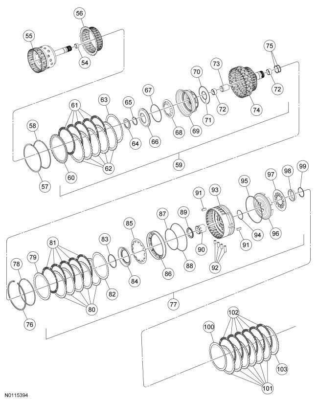 28. Install the low/reverse clutch plates, starting with the pressure plate and alternating between the friction and steel plates and ending with the wave spring plate on the top.
