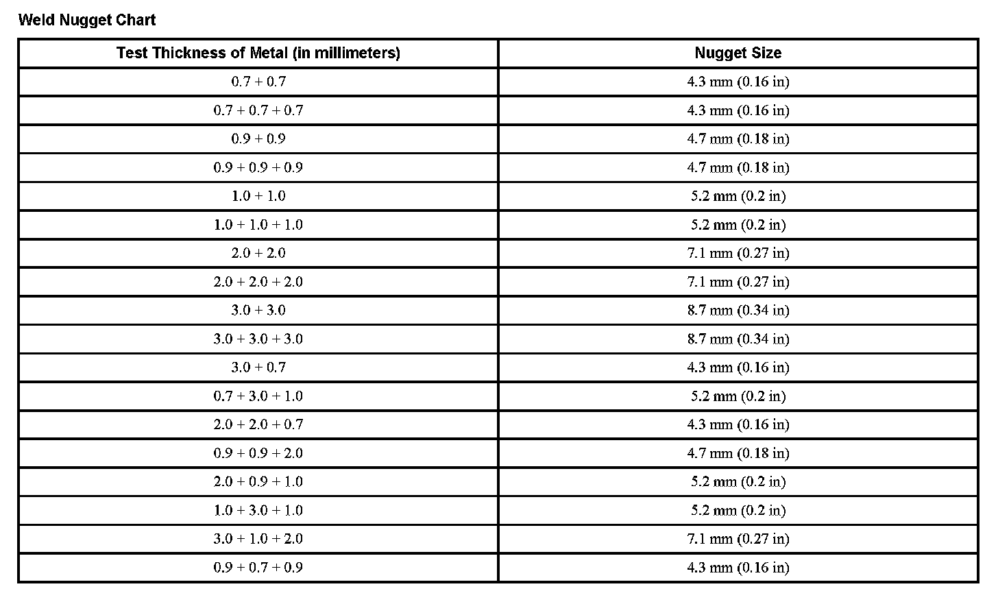 Weld Nugget Chart