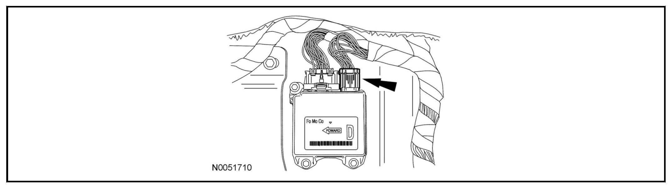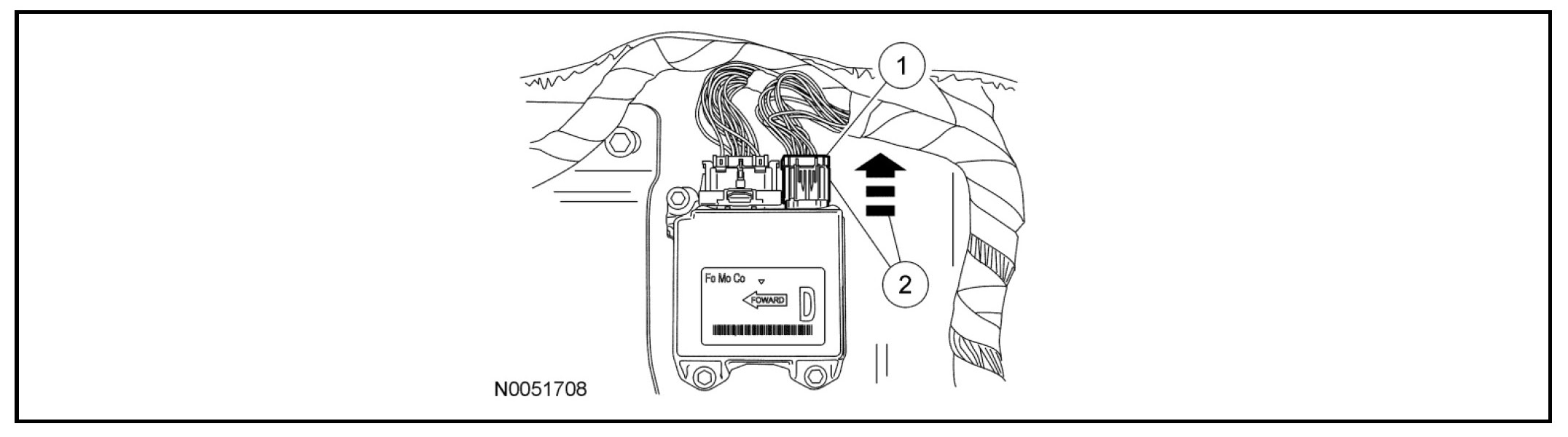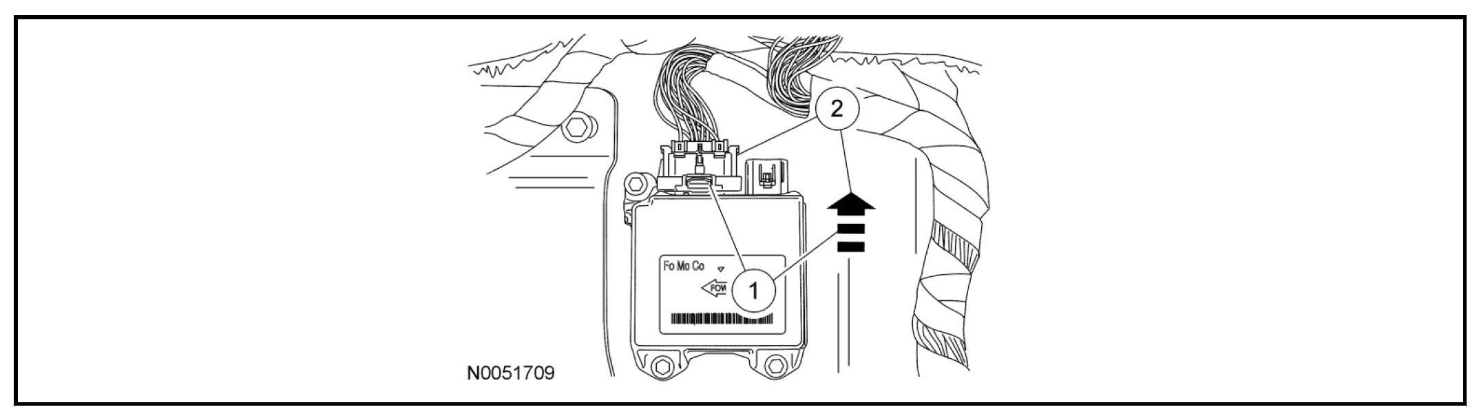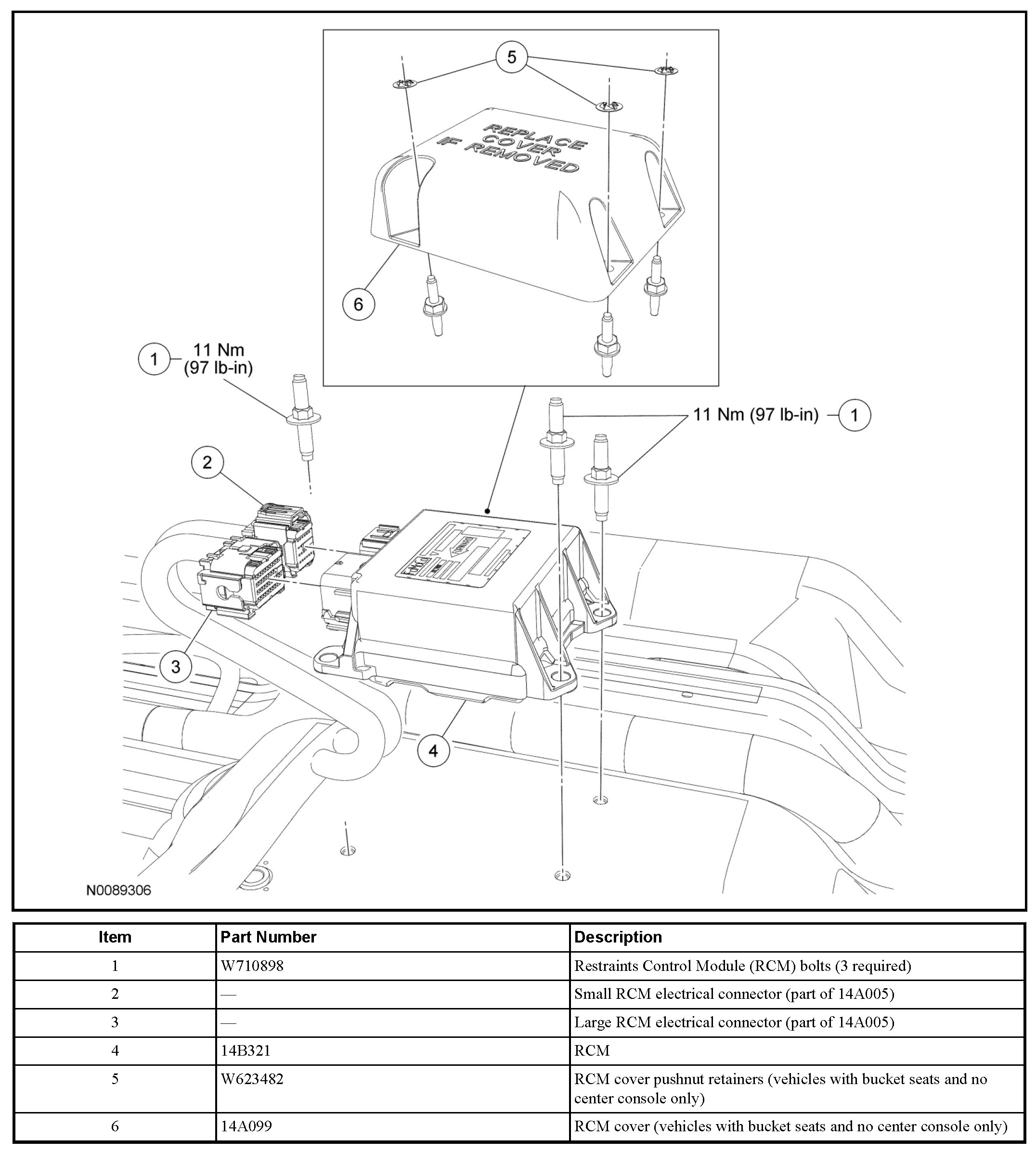 1. WARNING: Always tighten the fasteners of the restraints control module (RCM) and impact sensor (if equipped) to the specified torque. Failure to do so may result in incorrect restraint system operation, which increases the risk of personal injury or death in a crash.