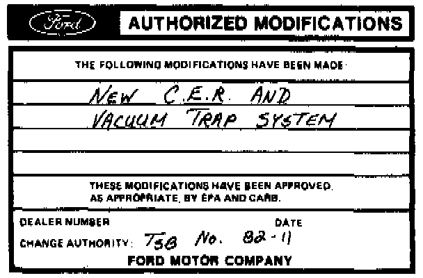 20. Obtain an Authorized Modifications decal and list the date, dealer P & A number and alterations performed as shown below. Select a prominent place adjacent to the Vehicle Emission Control Information decal suitable for installing the Authorized Modifications decal. Clean the area, install the decal and cover it with a clear plastic decal shield.