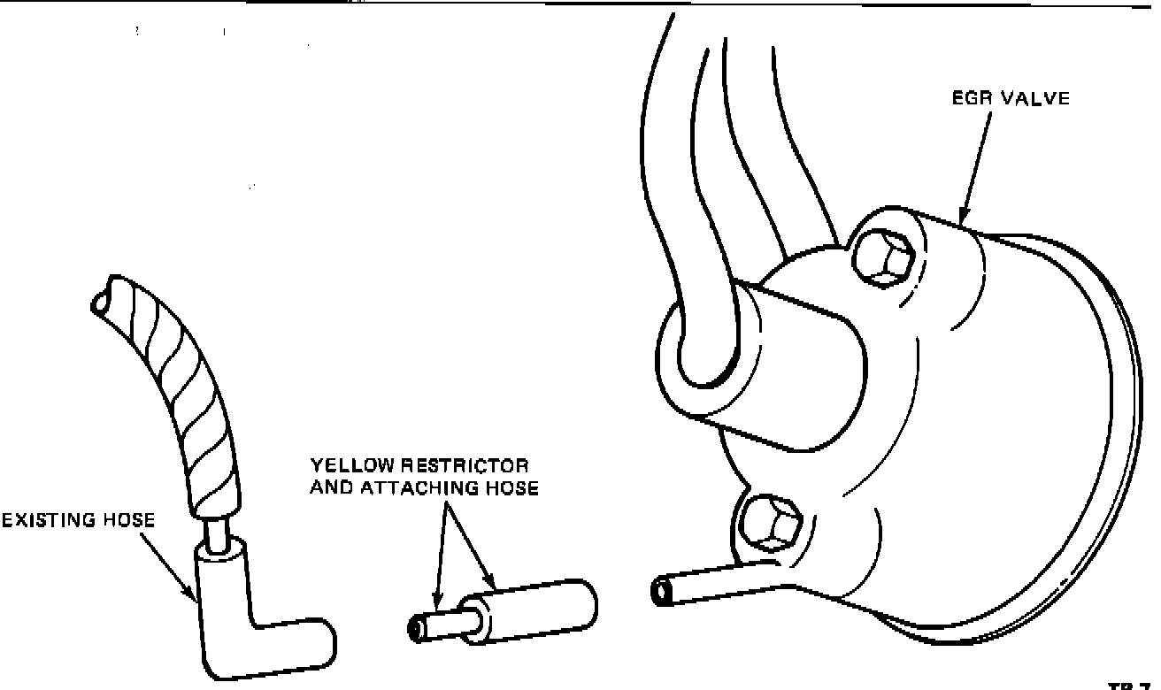 Check the vacuum source at EGR valve for the presence of a yellow plastic connector with a .030" restrictor. If no yellow connector is present, install the connector, part no. D9ZZ-12A225-A, as shown in Figure 9.