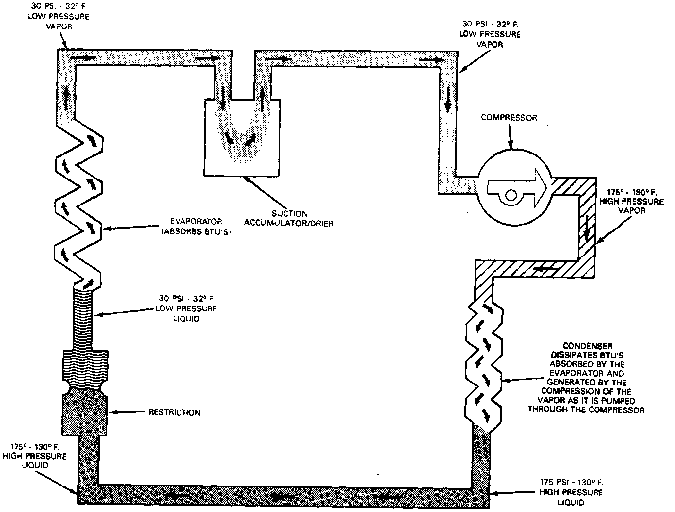 REFRIGERATION CYCLEWhen the magnetic clutch (which drives the compressor) is disengaged, the refrigerant in the system normalizes into a vaporized state. Upon clutch engagement, the vapor is compressed and elevated in temperature as it proceeds to the condenser.