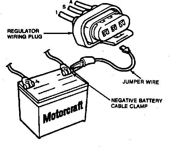 3. If indicator lamp does light, remove jumper wire and reconnect electrical connector to regulator. Connect voltmeter negative lead to battery negative post cable clamp and contact voltmeter positive lead to regulator A terminal screw. Battery voltage should be indicated. If battery voltage is not indicated, service A wiring circuit.
