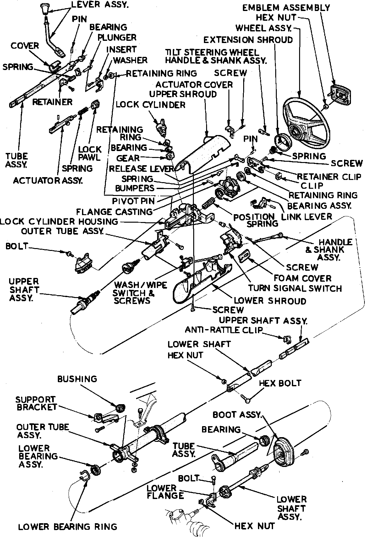 When servicing collapsible steering columns, care should be exercised since they are extremely susceptible to damage. Dropping of or leaning on column or striking sharp blows on end of steering shaft or shift levers could loosen or shear plastic fasteners which maintain column rigidity. It is important that only the specified screws, bolts and nuts be used during the mandatory reassembly sequence and torqued to specifications to insure proper breakaway action of column under impact. Avoid using excessively long bolts as they may prevent a portion of the steering column from collapsing under impact. When removing or installing, steering wheel, ignition switch or lock, turn signal switch, adjusting transmission linkage, or installing and adjusting neutral-start or back-up light switch, refer to appropriate car chapter. If a shift tube shows a sheared plastic injection, a new shift tube must be installed. If a steering shaft shows a sheared plastic, or if the steering column has been collapsed a complete new column must be installed. On some models, the attaching brackets will shear under impact and must also be replaced.Fig. 3 Exploded View Of Tilt Steering Column w/Column Shift: