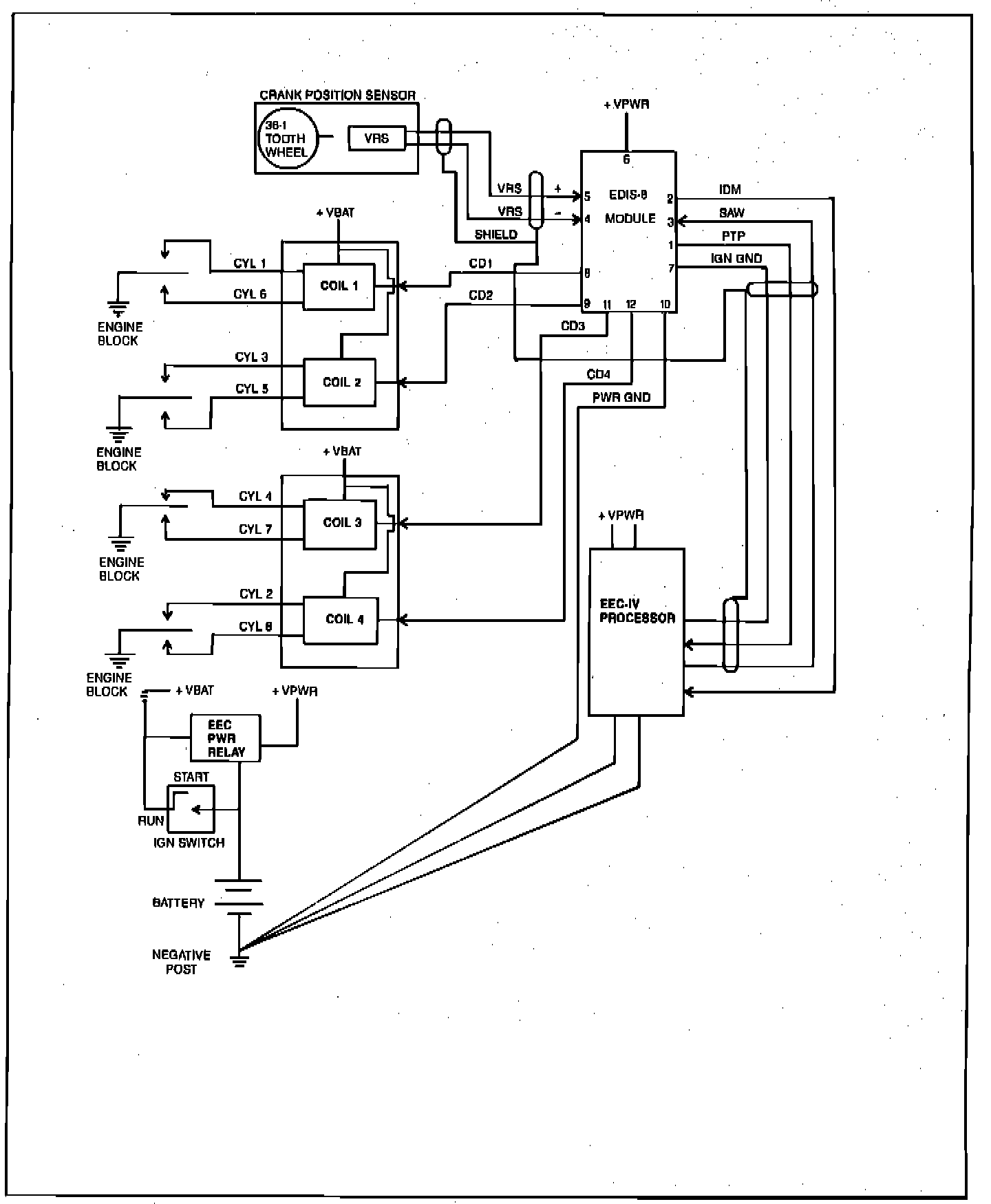 The EEC-IV Processor receives IGN GND and PIP signals from the EDIS module then generates a SAW output signal based upon engine speed load temperature and other sensor information. An IDM signal is received from the EDIS module to determine if an ignition failure mode should be recorded.