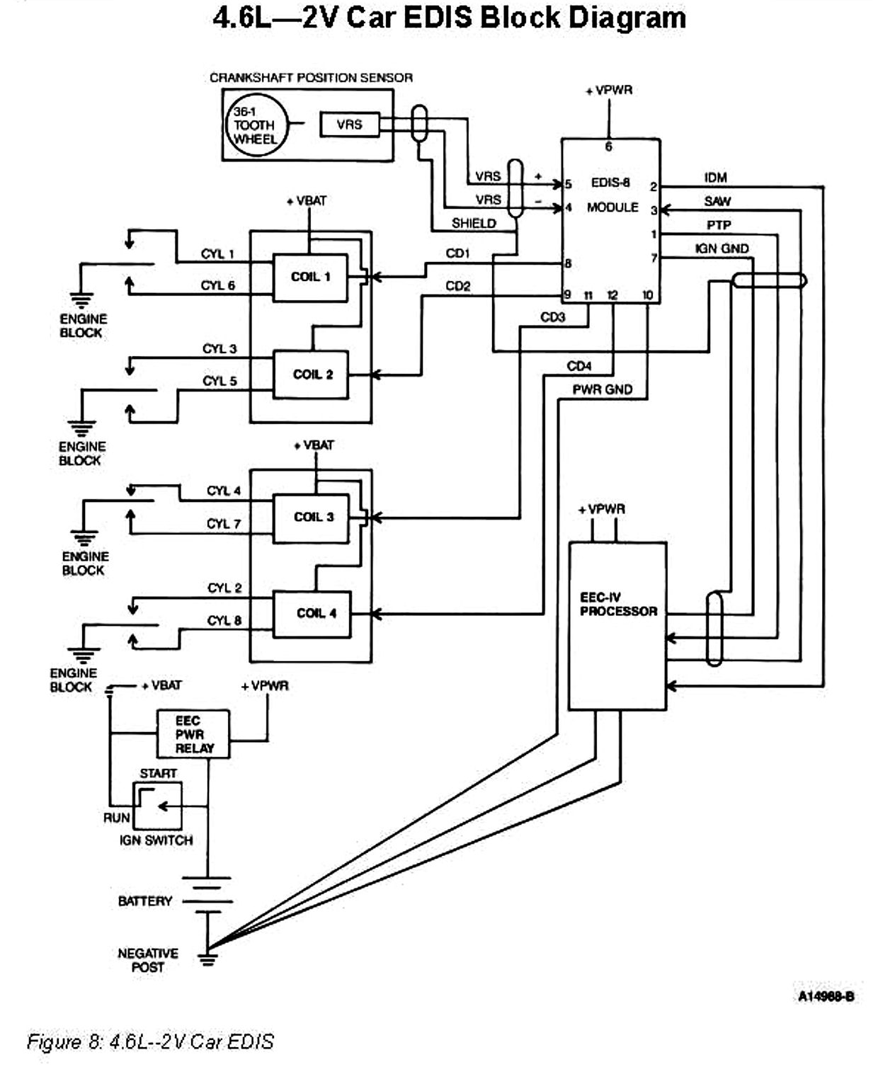The 4.6L Electronic Distributorless Ignition System (EDIS) consists of a Variable Reluctance Sensor (VRS) an EDIS Ignition Module an EEC-IV processor and two four-tower Coil Packs.