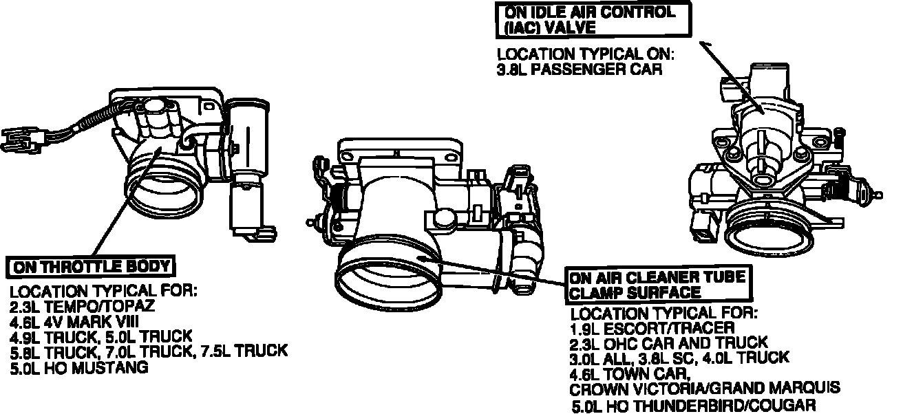 Curb and fast idle speeds are controlled by the Powertrain Control Module (PCM) and Idle Air Control (IAC) valve assembly. The IAC valve is not adjustable. A large increase or decrease in closed plate airflow from the calibrated level will not allow effective idle speed control.Throttle Body Assembly Decal Location: