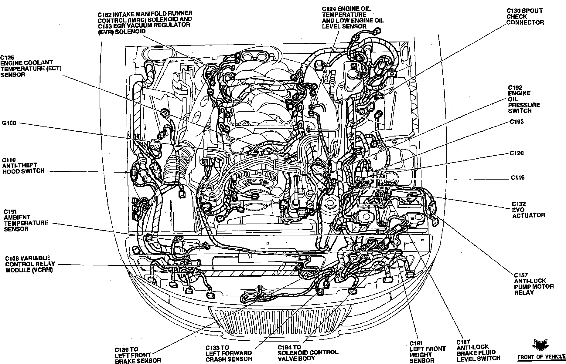 Lower front center of engine compartment.